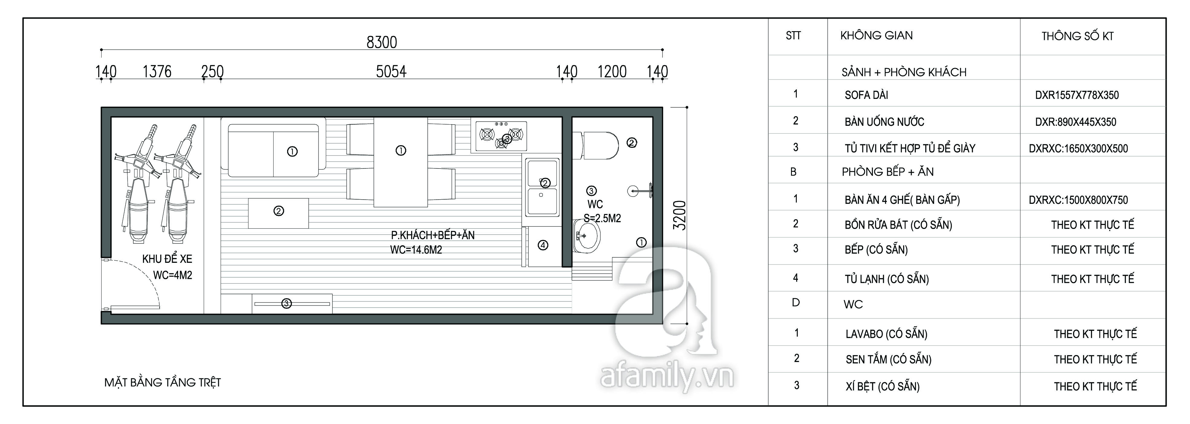 Vợ chồng tôi muốn sửa lại ngôi nhà cấp 4 có gác xép với, diện tích sàn là 3,2 x 8,3m. Chúng tôi muốn bố trí bếp và nhà vệ sinh ở phía trong cùng.