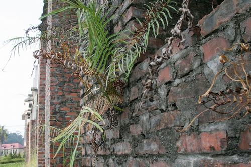 Do bỏ hoang lâu ngày không người ở nên tường nhà rêu phong ẩm mốc, cỏ dại mọc đầy