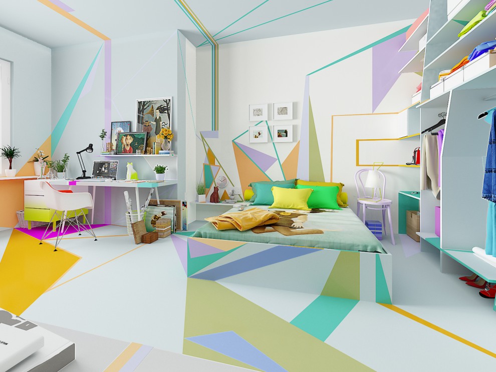 Khi nhìn vào căn phòng được thiết kế màu sắc này, bạn sẽ cảm thấy vô cùng thích thú bởi lẽ sự kết hợp những màu sắc này đều được lấy cảm hứng đồ họa chứ không giống như sắc màu thiết kế nội thất thông thường.